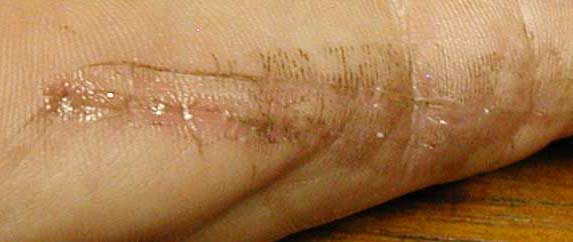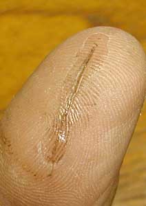 Next I tried Advanced Healing adhesive Band-Aids. If your injury is in a place where the bandages will stay attached, they work very well. They act like an artificial, waterproof scab. Taping the edges helps keep them in place longer. After a few days, presto, your cut is healed. On the palm of your hand, with all the flexing and abrasion, they don't last a day. Wearing vinyl gloves over them helps a little, but not much. !/weblog/images/31.jpg! I am a great fan of super glue (cyanoacrylate adhesives), particularly the industrial-strength stuff that has to be refrigerated. Usually the problem with your hands is that you glue them to something inappropriate. Gluing the edges of a cut together is another matter. After I got home, with my cuts still not completely healed, I found a Band-Aid cyanoacrylate bandage kit on the pharmacy shelf. It seems like pretty good stuff, particularly after being reinforced with a second coat of industrial cyanoacrylate. It is waterproof. I'm a little worried that its supposed to be removable with mineral oil, but we'll see how it works out. Don't want your cuts opening up if you get diesel or lube on them. Maybe the Band-Aid product is overkill and one should go directly to the good stuff, but I want to research cyanoacrylate toxicity a little before I try it on a big wound. PS: With a little more experience, it seems that keeping the cyanoacrylate layer thin works best. If you really pile it on, it doesn't bend with the skin and tends to start peeling off. © Electric Marine, September 5, 2002 © Electric Marine, September 5, 2002