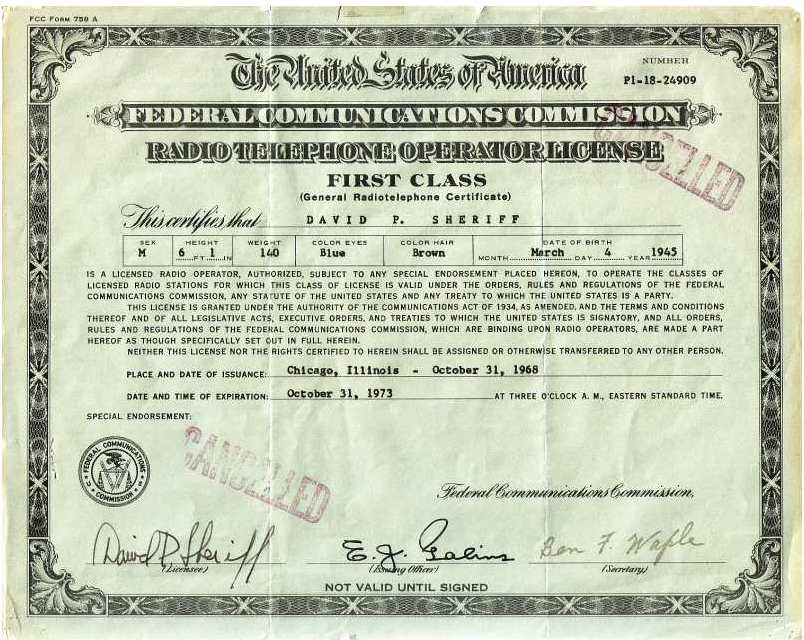 My FCC First Class license, required to assume technical responsibility for a commercial station, was issued a month after the second class license on October 31, 1968. The exam was structured in parts. The technical parts qualified you for the second-class license. Additional legal material plus the technical stuff qualified for the First Class license. I has pretty much learned the technical material as I grew up. I knew how vacuum tube electronics worked. I got a handbook and studied for a few days and traveled to Chicago to the FCC field office and took the test. To divide up the study time, I took the second class exam first. With that license in-hand, I took the First Class exam. That's why the license dates are only a month apart. The second class license was cancelled when I got the First. The license term ran for five years and was renewable. I held the license for 10 or 15 years.