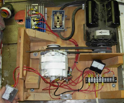 The stand is useful in those instances where it is somewhat unclear whether a charging problem is with an alternator or with it's installation. It's also useful in setting the voltage regulator or for testing voltage regulators under real conditions. The test stand was also useful to allow me to put different alternators through their paces, which helped solidify my understanding of how they work. My camera apparently has a pretty fast flash/shutter as the test stand was in operation when the photo was taken and everything looks like it's standing still. The built-in meters give me a guide to performance, but for accurate measurements I use my usual diagnostic tools, which have a voltage and current accuracy on the order of a few percent. |